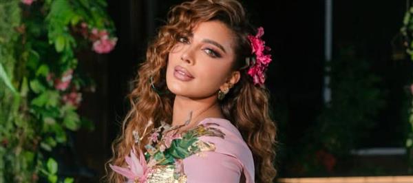 أصالة أكملت اللوك بتسريحة شعرها الكيرلي، وزينته بأزهار باللون الفوشي، أما المجوهرات فتنوعت ما بين الملونة والذهبية اللون.