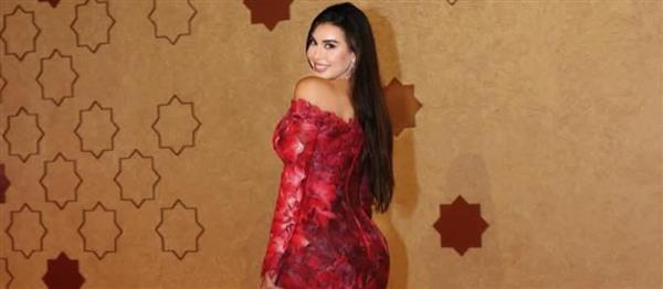 واعتمدت ياسمين على فستان باللون الأحمر يشبه بتلات الورد وعقد الماظ باللون الأخضر.