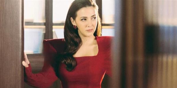 إطلالة دنيا اعتمدت فيها تسريحة شعر منسدلة ومكياج خفيف مع أقراط حمراء وخاتم مستطيل.