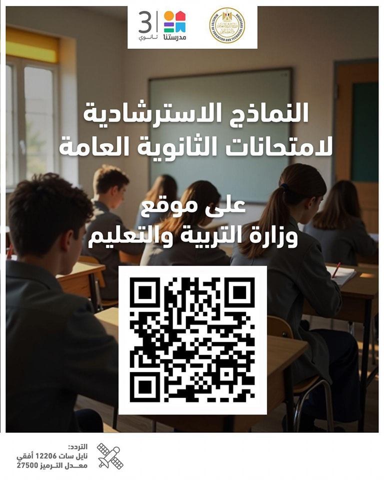 كما تعلن الوزارة إتاحة حل النماذج الاسترشادية عبر قناة "مدرستنا 3"، حيث يخصص يوم لكل مادة، وذلك في تمام الساعة العاشرة مساء يوميا، على أن تكون الإعادة في تمام الساعة العاشرة صباح اليوم التالي، وذلك عبر تردد القناة على النايل سات 12206 أفقي معدل ترميز 27500.