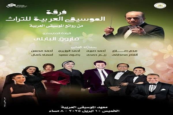 تنظم دار الأوبرا برئاسة الدكتور علاء عبد السلام، حفلاً لفرقة الموسيقى العربية للتراث، بقيادة المايسترو فاروق البابلى فى الثامنة مساء الخميس 10 أبريل على مسرح معهد الموسيقى العربية، وذلك ضمن أنشطة وزارة الثقافة.