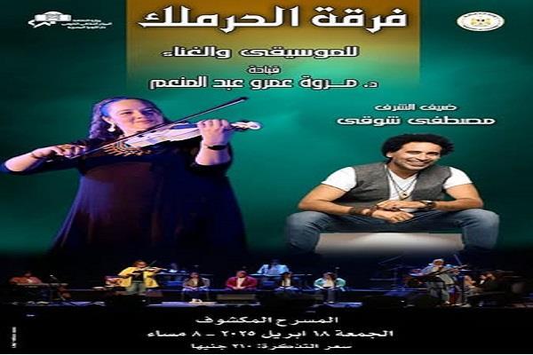 تنظم دار الأوبرا برئاسة الدكتور علاء عبد السلام، حفلًا لفرقة الحرملك للموسيقى والغناء بقيادة المايسترو الدكتورة مروة عبد المنعم، و تستضيف الفنان مصطفى شوقي وذلك فى الثامنة مساء الغد الجمعة 18 أبريل على المسرح المكشوف .