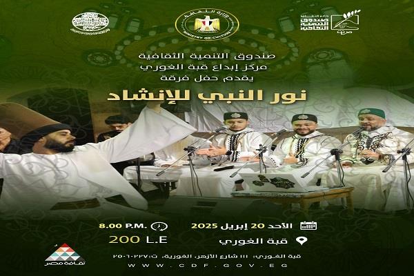 في إطار اهتمام وزارة الثقافة المصرية بإحياء التراث الروحي والصوفي، ينظم صندوق التنمية الثقافية من خلال مركز إبداع قبة الغوري بشارع الازهر، أمسية إنشادية تقدمها فرقة "نور النبي للإنشاد" وذلك يوم الأحد 20 أبريل، في تمام الثامنة مساءً .