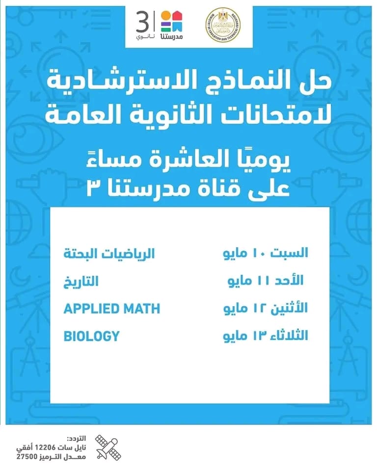 ونوهت التعليم إلى أنه يمكن متابعة حلها عبر قناة "مدرستنا ٣" يوميًا فى تمام الساعة العاشرة مساءً، على أن تكون الإعادة فى تمام الساعة العاشرة صباح اليوم التالي، وذلك عبر تردد القناة على النايل سات 12206 أُفقي معدل ترميز 27500.