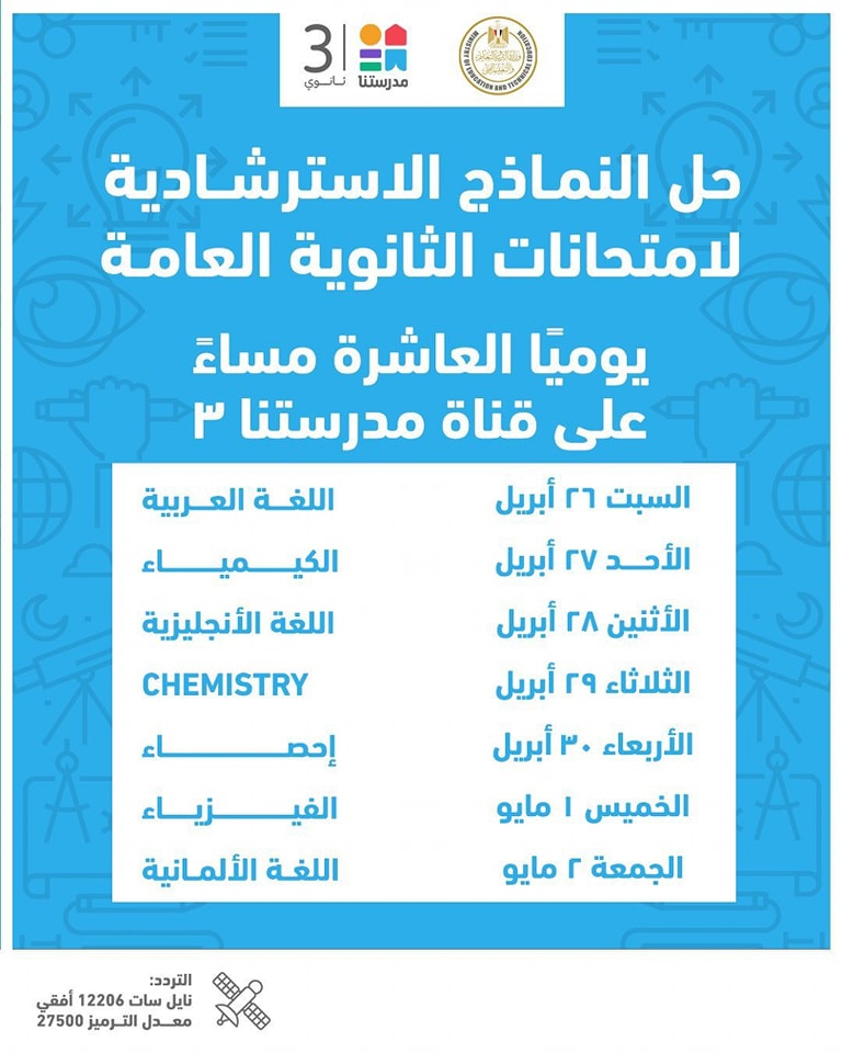 وبدأت وزارة التربية والتعليم والتعليم الفني جدول مواعيد إتاحة النماذج الاسترشادية لامتحانات شهادة إتمام الثانوية العامة بداية من السبت الماضي، وذلك عبر الموقع الرسمي للوزارة، كما يمكن متابعة حلها عبر قناة "مدرستنا 3 يوميا فى تمام الساعة العاشرة مساء، على أن تكون الإعادة فى تمام الساعة العاشرة صباح اليوم التالي، وذلك عبر تردد القناة على النايل سات 12206 أُفقي معدل ترميز 27500.