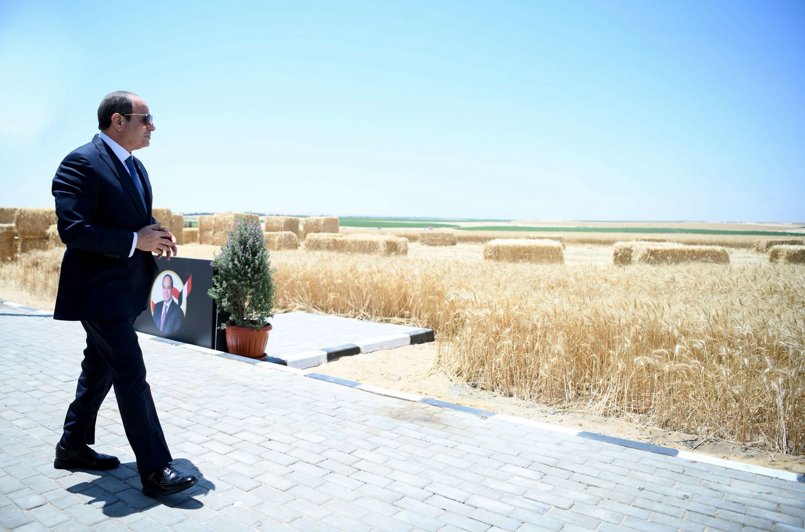 وأضاف المتحدث الرسمي أن السيد الرئيس قام بعد ذلك بإزاحة الستار عن لوحة تذكارية إيذاناً بافتتاح المرحلة الأولى من مدينة مستقبل مصر الصناعية بمحور الشيخ زايد بمحافظة الجيزة، ثم قام سيادته بجولة تفقدية، تضمنت تفقد ثلاجات التخزين، ومصنع للعلف، ومصنع للمجففات، وصولاً إلى منطقة الصوامع. وفي طريق سيادته إلى مزرعة الخير لمشاهدة حصاد القمح، تفقد السيد الرئيس جواً المشروع الجديد لمدينة مستقبل مصر، كما استمع سيادته الى شرح بالمزرعة حول منتجاتها من قبل العقيد الدكتور بهاء الغنام، ثم توجه السيد الرئيس بعد ذلك إلى مقر الإدارة المركزية لجهاز مستقبل مصر، حيث تم التقاط صورة تذكارية لسيادته مع كبار المسؤولين والضيوف والعاملين بالمركز.