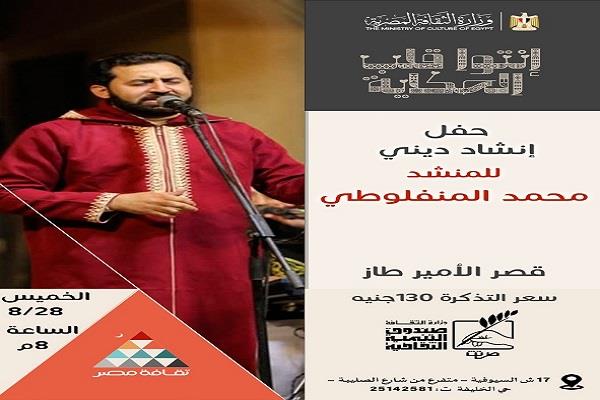 يقيم قطاع صندوق التنمية الثقافية بمركز إبداع "قصر الأمير طاز" بشارع السيوفية بالخليفة، حفلاً للإنشاد الدينى للمنشد محمد المنفلوطى وذلك في الثامنة مساء غداً (الخميس 28 أغسـطـس).
