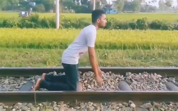 وفي الفيديو، ظهر الشاب وهو يبتسم أمام الكاميرا قبل أن يركع ثم يستلقي بشكل كامل على قضبان السكك الحديدية، وبعد لحظات مر القطار السريع فوقه.