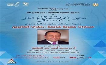 ينظم صالون نفرتيتي الثقافي فعالية جديدة تحت عنوان "مسارات مصرية قديمة.. ذكرى العابرين"، وذلك مساء الأحد الموافق 14 سبتمبر 2025، في مركز إبداع قصر الأمير طاز، التابع لصندوق التنمية الثقافية.