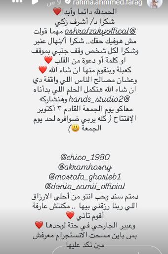 وتابعت:"إن شاء الله هنكمل الحلم اللي بدأناه وهنشاركه معاكو يوم الجمعة القادم 3 أكتوبر الافتتاح الكوافير هاند الاستديو ، يربي ضوافره لحد يوم الجمعة".