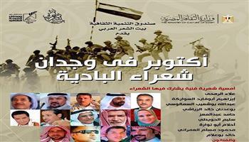 ينظم من خلال بيت الشعر العربي ببيت الست وسيلة، أمسية شعرية وفنية بعنوان «أكتوبر في وجدان شعراء البادية»، وذلك في تمام الثامنة من مساء اليوم السبت 4 أكتوبر الجاري، بمركز إبداع الست وسيلة خلف الجامع الأزهر.