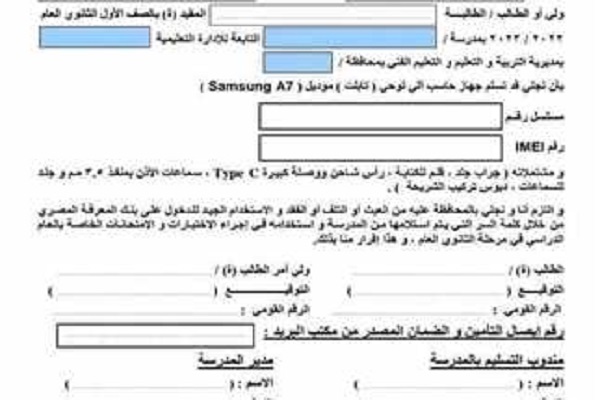 إقرار استلام وتعهد، يتم توقيعه من الطالب وولي الأمر، يتضمن الالتزام بالحفاظ على الجهاز وتحمل التكاليف في حالة الفقد أو التلف.