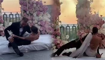 رومانسية تحولت لصدمة.. ألعاب نارية تسقط عروسان على الأرض