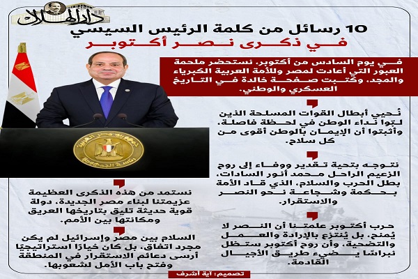 دعوة إلى جميع المصريين لمواصلة العمل من أجل رفعة الوطن، متسلحين بروح أكتوبر التي لا تعرف المستحيل.
