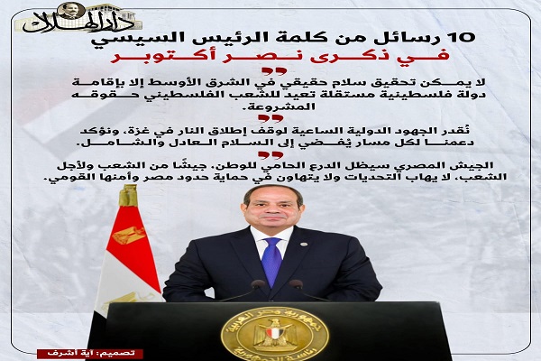 ألقى السيد الرئيس عبد الفتاح السيسي كلمة مهمة، أمس السبت، بمناسبة الذكرى الـ52 لانتصارات حرب أكتوبر المجيدة، أكد فيها على المعاني الخالدة التي تحملها هذه المناسبة الوطنية، وعلى التزام الدولة بمواصلة مسيرة البناء والتنمية مستلهمةً من روح أكتوبر.