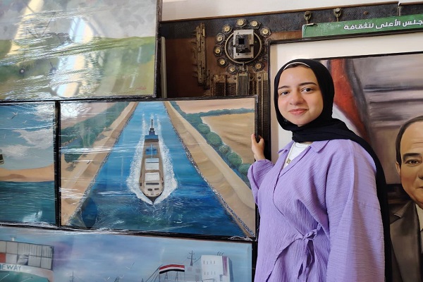 وكذلك عرضت الطالبة نورهان خالد عبدالسلام بكلية الآداب قسم آثار، بجامعة بنها لوحة مرسومة للرئيس الراحل محمد أنور السادات.
