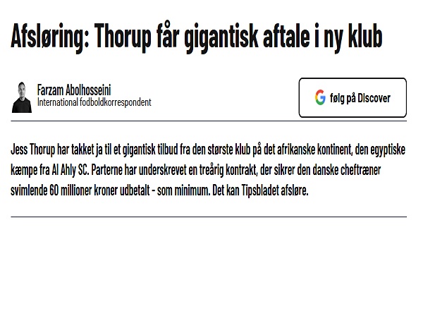 ذكرت تقارير صحفية دنماركية، أن جيس ثورب المدير الفني الدنماركي، وقع على عقود تدريب الأهلي، بعد أن توصل إلى اتفاق حول كافة بنود العقد.