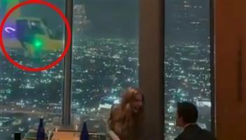 وفي الفيديو، ظهر الثنائي وهما يتناولان وجبتهما في الطابق الـ71 من برج "U.S. Bank Tower"، وفي لحظة فوجئ الجميع بظهور مروحية تحلّق خارج الزجاج مباشرة، تحمل لافتة مضيئة كتب عليها "قالت نعم" مزينة برمز قلب أحمر.