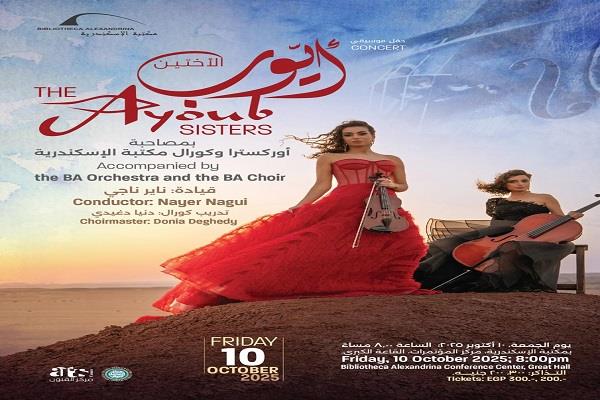 تقيم مكتبة الإسكندرية، حفلاً موسيقياً للثنائي المصري الإسكتلندي العالمي "الأختين أيوب"، بمصاحبة أوركسترا وكورال مكتبة الإسكندرية بقيادة المايسترو ناير ناجي، الجمعة الموافق 10 أكتوبر في تمام الثامنة مساءً، على المسرح الكبير بالمكتبة.