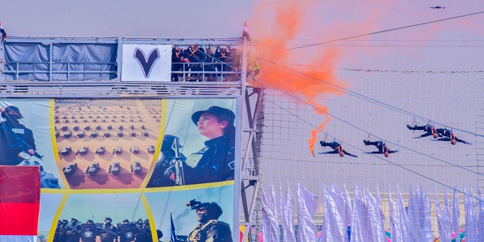 وأضاف السفير محمد الشناوي، المتحدث الرسمي، أن برنامج الاحتفال تضمن عروضًا رياضية أظهرت مهارات الكفاءة البدنية والدفاع عن النفس، تلتها عروض تدريبية قتالية، واستعراضات لخيالة كلية الشرطة، ومركبات هيئة الشرطة، وتجهيزات قوات المهام الخاصة، ثم العرض العسكري العام، ومراسم تسليم وتسلم القيادة، وحلف يمين الولاء.