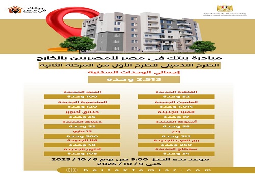 أعلن المهندس شريف الشربيني، وزير الإسكان والمرافق والمجتمعات العمرانية، أن اليوم الخميس 9 أكتوبر 2025 بدء حجز الوحدات السكنية بالطرح التكميلي للطرح الأول ضمن المرحلة الثانية من مبادرة "بيتك في مصر"، المخصصة للمصريين المقيمين بالخارج، وذلك عبر الموقع الإلكتروني الرسمي للمبادرة.