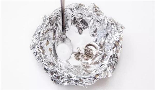 لإعادة بريق القطع الفضية ضعي وعاء بورق الألومنيوم ثم اسكبي ماء ساخن مع ملح أو بيكربونات، ثم ضعي القطع بداخله ، تتفاعل المعادن بحيث تنتقل الشوائب إلى الورق ويستعاد البريق.