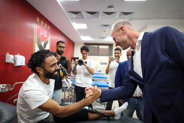 دار حديث ودي بين الدنماركي ياس سوروب، المدير الفني الجديد للفريق الأول لكرة القدم بالنادي الأهلي، مع حسين الشحات لاعب الفريق.