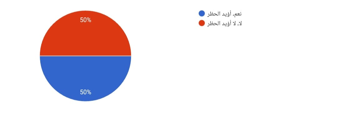 وفي ما يخص الموقف من حظرها، انقسمت الآراء بالتساوي؛ إذ أيد 50% من المشاركين تحرك السلطات لحظر «الإسكوتر» في الشوارع العامة، بينما رفض 50% هذا التوجه.