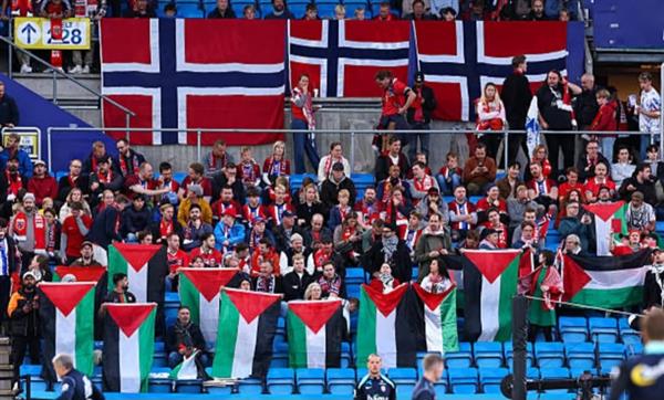 زينت أعلام فلسطين مدرجات جمهور منتخب النرويج، في مباراته المقامة حاليا أمام فريق الكيان الصهيوني، ضمن تصفيات أوروبا المؤهلة لبطولة كأس العالم.