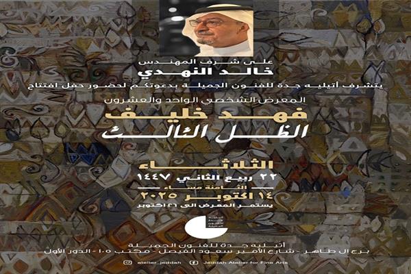 يشهد أتيليه جدة للفنون، في الثامنة من مساء غد الثلاثاء، افتتاح المعرض الشخصي الحادي والعشرين للفنان التشكيلي فهد خليف تحت عنوان "الظل الثالث".
