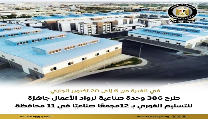 "الصناعة" تطرح 386 وحدة صناعية جاهزة في 11 محافظة لدعم رواد الأعمال| إنفوجراف