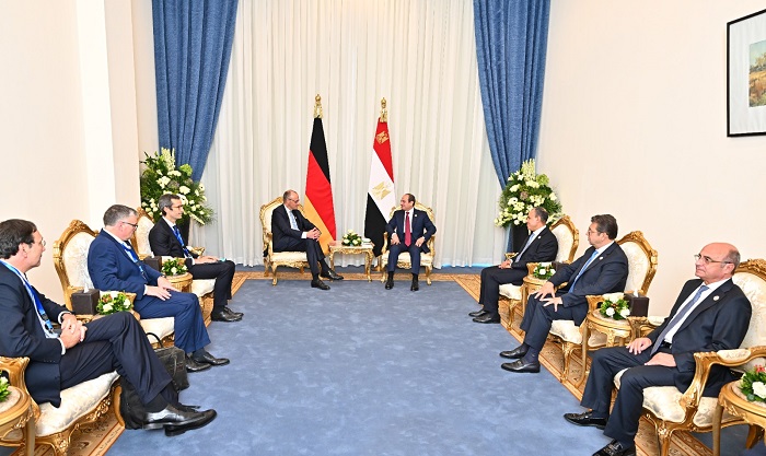 وصرح المتحدث الرسمي باسم رئاسة الجمهورية بأن المستشار الألماني استهل اللقاء بتوجيه الشكر للسيد الرئيس على الجهد الذي قام به، والذي أسفر عن وقف إطلاق النار في قطاع غزة، مؤكداً على أنه لولا جهد السيد الرئيس ما كان يمكن التوصل إلى الاتفاق ذي الصلة، معرباً عن الأمل في أن يكون السلام ممتداً، مع استعداد ألمانيا للمساعدة في عملية إعادة إعمار قطاع غزة. من جانبه، أعرب السيد الرئيس عن تقديره الكبير لألمانيا وشعبها، مؤكداً حرص سيادته على مواصلة تعزيز العلاقات المصرية الألمانية وتطويرها لتصل إلى مستوى الشراكة الاستراتيجية، مضيفاً سيادته أنه من الهام تعزيز تواجد كبرى الشركات الألمانية في السوق المصري، خاصةً مع اتفاقيات التجارة الحرة التي أبرمتها مع مصر مع الدول العربية وأفريقيا.
