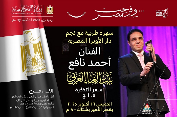 ينظم قطاع صندوق التنمية الثقافية أمسية فنية يحييها الفنان أحمد نافع، في الثامنة من مساء الخميس 16 أكتوبر، وذلك بـ بيت الغناء العربي بقصر الأمير بشتاك بشارع المعز لدين الله الفاطمي.