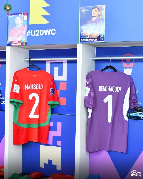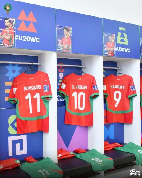 زينت قمصان منتخب المغرب للشباب، غرفة الملابس استعدادًا لمواجهة فرنسا، في نصف نهائي بطولة كأس العالم تحت 20 سنة، المقامة حاليًا في تشيلي.