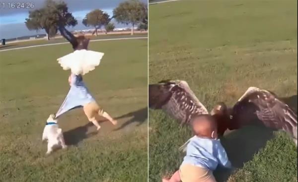 تناقل رواد مواقع التواصل الاجتماعي مقطع فيديو صادم، يوثق اللحظة التي قام فيها نسر بالانقضاض على طفل رضيع كان يزحف على العشب، قبل أن يتدخل كلب صغير ويحاول إنقاذه.