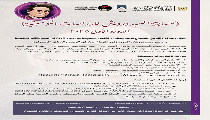 ضمن برنامج وزارة الثقافة للاحتفال باليوم المصري للموسيقي، يقيم المركز القومي للمسرح و الموسيقى و الفنون الشعبية مسابقة «السيد درويش للدراسات الموسيقية» الدورة الأولى بعنوان « دور زكريا أحمد في المسرح الغنائي»