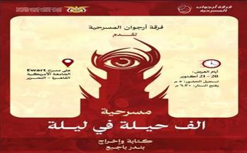 تقدم فِرْقَة «أرجوان المسرحية» لعرض مسرحية «ألف حيلة في ليلة» بقاعة إيوارت بمقر الجامعة الأمريكية بالتحرير اليوم وغدًا 20 و21 أكتوبر في تمام الساعة السادسة، وذلك تحت رعاية المركز الثقافي اليمني بالقاهرة.