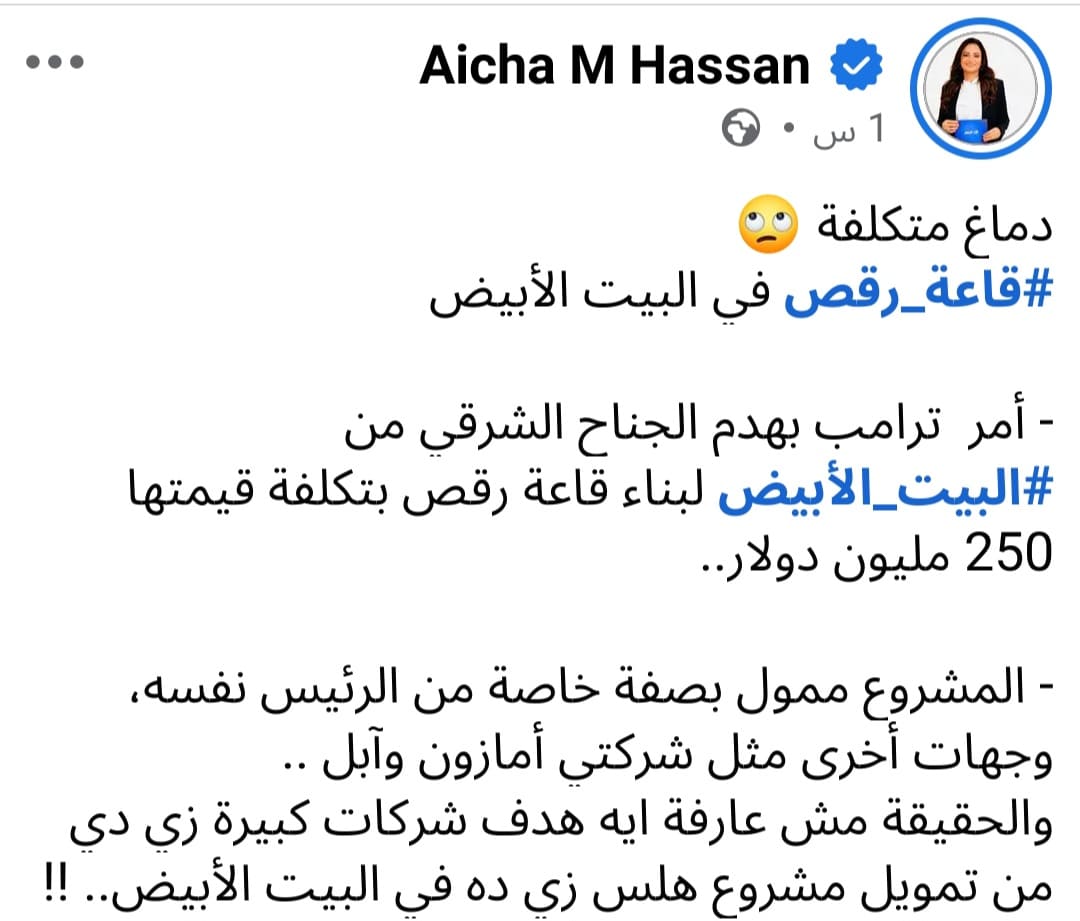 بينما قال إبراهيم الريدي، في منشور ساخر عبر صفحته على "فيسبوك"، إن الرئيس دونالد ترامب يبدو وكأنه قرر العودة بقوة، ولكن هذه المرة بعيدًا عن السياسة، بعد قراره تحويل جزء من البيت الأبيض إلى قاعة رقص ضخمة.