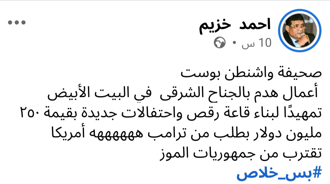 وكتب أحمد خزيم، عبر صفحته على "فيسبوك"، تعليقًا ساخرًا على ما نشرته صحيفة "واشنطن بوست" بشأن هدم أجزاء من الجناح الشرقي في البيت الأبيض، تمهيدًا لبناء قاعة رقص واحتفالات جديدة بقيمة 250 مليون دولار بطلب من الرئيس الأمريكي دونالد ترامب، قائلًا:"أمريكا تقترب من جمهوريات الموز.. ههههههه"، على حد وصفه.