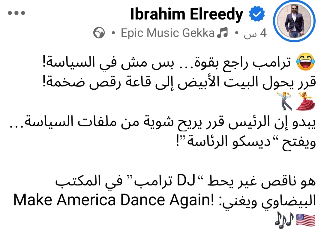 وأضاف الريدي: "يبدو أن ترامب قرر يأخذ استراحة من ملفات السياسة ويفتح ما أسماه 'ديسكو رئاسي'"، مضيفًا بسخرية: "لم يتبقَ سوى أن يضع لافتة DJ ترامب في المكتب البيضاوي، ويردد شعاره الجديد: Make America Dance Again!"، وفق قوله.