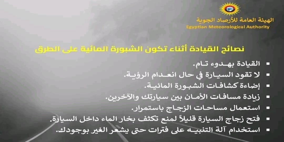 قدمت الهيئة العامة للأرصاد الجوية مجموعة من النصائح الهامة لقائدي المركبات، في ظل ما تشهده البلاد من تكوّن كثيف للشبورة المائية خلال فترات الصباح، بما يساهم في الحد من الحوادث ويحافظ على سلامة المواطنين أثناء انخفاض مستوى الرؤية الناتج عنها.