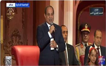 قال الرئيس عبد الفتاح السيسي، إن يجب أن يبدأ كلامه بالحمد لله والشكر لله، قبل أن يوجه كلمات الشكر للحاضرين في الاحتفالية ردًا على كلمات بنحبك يا ريس.