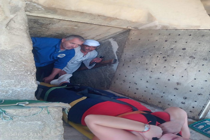 وأضاف "عبد الغفار" أن السائحة انزلقت على منحدر خشبي شديد الانحدار داخل أحد الممرات الضيقة بالهرم، مما أسفر عن اشتباه كسر في القدم، مشيرًا إلى أن طاقم الإسعاف دخل الهرم عبر ممر ضيق يمتد نحو 80 مترًا تحت الأرض، بعرض لا يتجاوز المتر الواحد، الأمر الذي تطلب مجهودًا استثنائيًا بسبب ضيق المساحة وضعف التهوية.