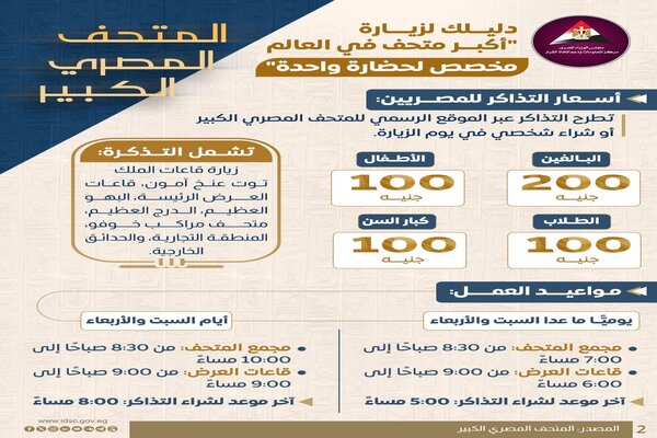 ونشر مركز معلومات مجلس الوزراء دليلًا مفصلًا حول أسعار التذاكر ومواعيد العمل وأماكن الزيارة داخل المتحف الذي يعد بوابة جديدة لاكتشاف الحضارة المصرية القديمة، وفي السطور التالية تستعرض بوابة "دار الهلال" ما جاء في دليل مركز معلومات مجلس الوزراء..