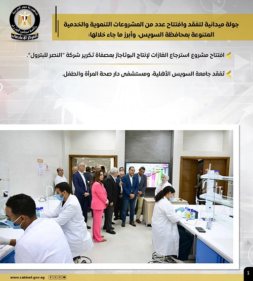 وتضمنت الأنشطة، إجراء رئيس الوزراء جولة ميدانية بمحافظة السويس، شملت تفقد وافتتاح عدد من المشروعات التنموية والخدمية، من أبرزها افتتاح مشروع استرجاع الغازات لإنتاج البوتاجاز بمصفاة تكرير شركة "النصر للبترول"، وكذلك تفقد جامعة السويس الأهلية، ومستشفى دار صحة المرأة والطفل.
