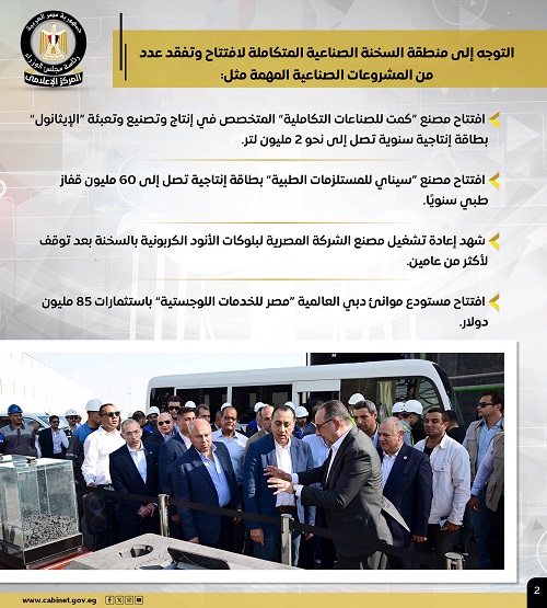 وخلال الجولة، افتتح وتفقد عددًا من المشروعات الصناعية المهمة بمنطقة السخنة الصناعية المتكاملة، شملت افتتاح مصنع "كمت للصناعات التكاملية" لإنتاج وتعبئة "الإيثانول" بطاقة إنتاجية 2 مليون لتر سنويًا، وكذلك افتتاح "مصنع سيناي للمستلزمات الطبية" بطاقة إنتاجية 60 مليون قفاز طبي سنويًا.
