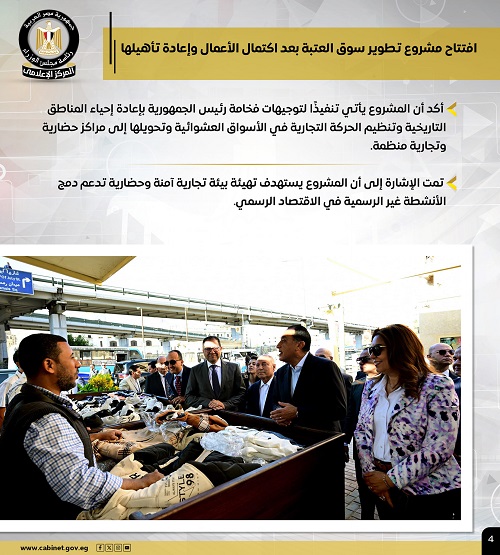 وافتتح مشروع تطوير سوق العتبة بعد اكتمال أعمال تطويره وإعادة تأهيله، تنفيذًا للتوجيهات الرئاسية بإعادة إحياء المناطق التاريخية وتنظيم الحركة التجارية في الأسواق العشوائية وتحويلها إلى مراكز حضارية وتجارية منظمة.