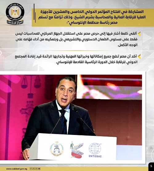 وتضمنت الأنشطة، مشاركة رئيس الوزراء في افتتاح المؤتمر الدولي الـ 25 للأجهزة العليا للرقابة المالية والمحاسبة بشرم الشيخ، تزامنًا مع تسلم مصر رئاسة منظمة "الإنتوساي"، وخلال كلمته بالمؤتمر ، أكد حرص الدولة على استقلال الجهاز المركزي للمحاسبات وتمكينه من أداء مهامه على الوجه الأكمل، مشيرًا إلى أن مصر تضع جميع إمكاناتها وخبراتها المهنية وتجاربها الرائدة قيد إفادة المجتمع الدولي للرقابة خلال الدورة الرئاسية القادمة للإنتوساي.