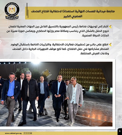 وأجرى رئيس الوزراء جولة ميدانية لمتابعة اللمسات النهائية لاحتفالية افتتاح المتحف المصري الكبير، مشيرًا إلى التوجيهات الرئاسية بالتنسيق الفاعل بين الجهات المعنية لضمان خروج الحفل بالشكل الذي يتناسب مع مكانة مصر وإرثها الحضاري ويعكس صورة مميزة عن إنجازات الدولة المصرية.