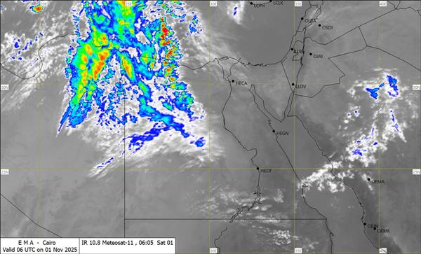 ووفقًا لصور الأقمار الصناعية، تظهر السحب المتوسطة والعالية على مناطق متفرقة من محافظة مطروح، إلى جانب بعض السحب المنخفضة على جنوب البلاد.